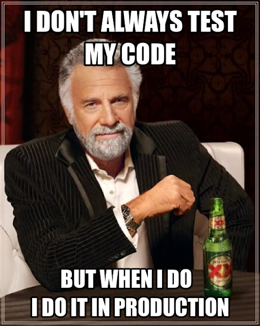 It's too good to skip... The The Most Interesting Man in The World ads originally designed for Dos Equis have gone viral, and certainly made their way to software geek circles. But thinking about this, have you ever observed overconfidence, cowboy attitude or perhaps unrealistically aggressive deadlines that allow the only one flavor of testing - not testing at all ? (Here I don't mean the fancy Testing in Production or Function Testing in Production automation methodologies).