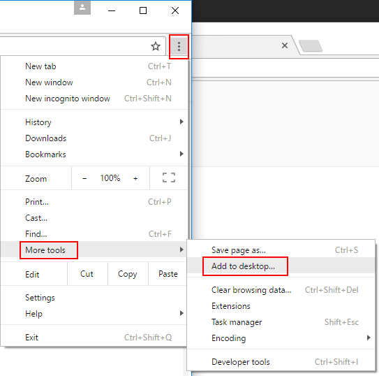 Alright, are you ready? All you need is Windows operating system and Chrome browser. Now please launch Chrome. Click on the Hamburger menu (3 dots) select "More tools" and "Add to desktop":